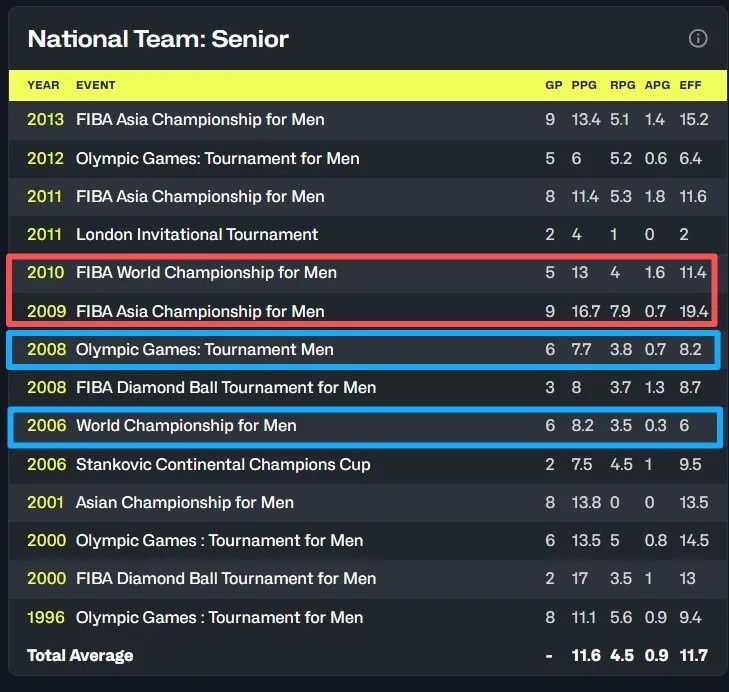 其实无论是在这次世锦赛还是之后的08年奥运会,王治郅与姚明的搭档都谈不上合拍,而在没有姚明的2009亚洲杯和2010世锦赛,王治郅却都贡献了生涯最佳大赛表现——没办法,内线的舞台就这么大,中国队那几年在内线的天赋太拥挤了。