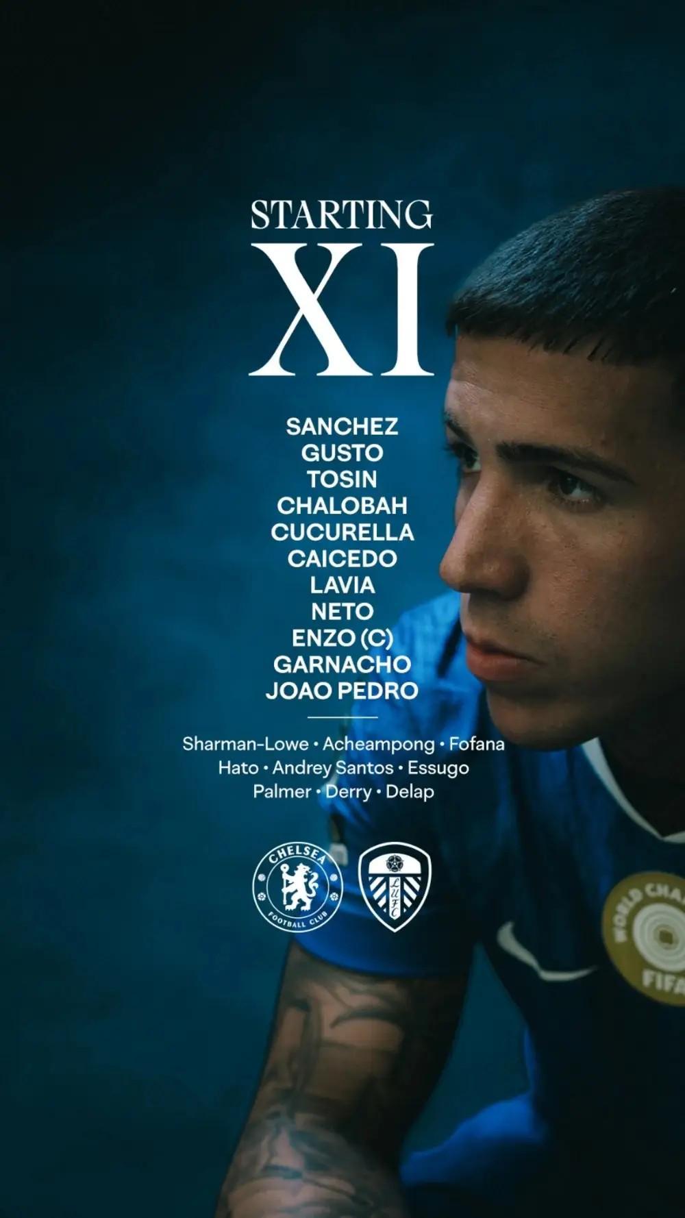 切尔西首发:1-桑切斯、27-古斯托、4-阿达拉比奥尤、23-特雷沃-查洛巴、3-库库雷利亚、25-莫伊塞斯-凯塞多、45-拉维亚、7-佩德罗-内托、8-恩佐、49-加纳乔、20-若昂-佩德罗