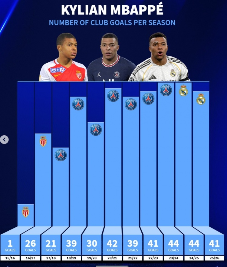 4月25日讯 《转会市场》统计了姆巴佩俱乐部生涯各赛季进球数情况,已连续6个赛季至少打进39球。本赛季在还剩6轮联赛的情况下,距离个人单赛季进球纪录仅差3球。
